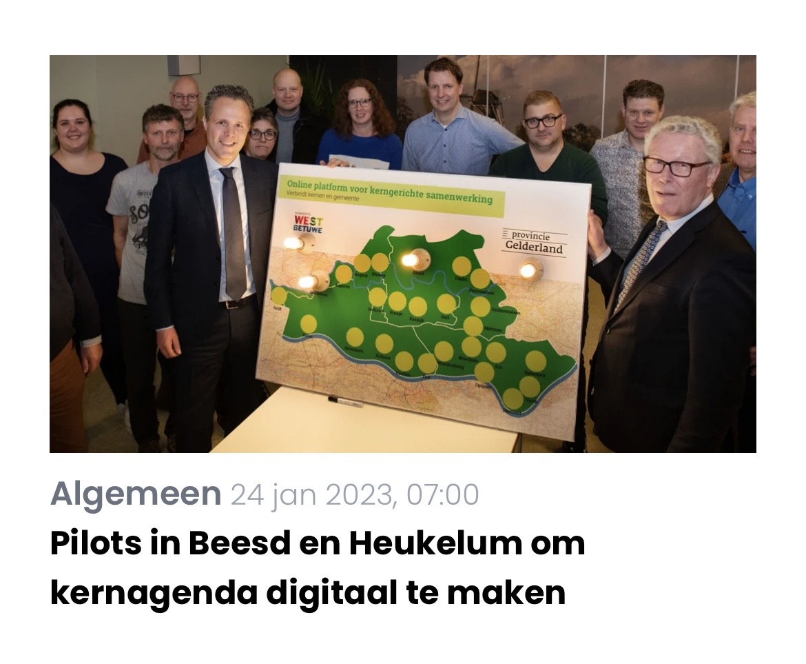- We hebben een speciaal platform Samen in West Betuwe (voorheen Bloei!) ontwikkeld en ingevoerd via een pilot. De pilotgemeenten Heukelum en Beesd zijn enthousiast. We gaan dit project nu uitrollen over heel West Betuwe. Samen in West Betuwe bestaat zowel uit fysieke bijeenkomsten als een digitaal platform ter bevordering van kerngerichte communicatie en samenwerking met de gemeente.